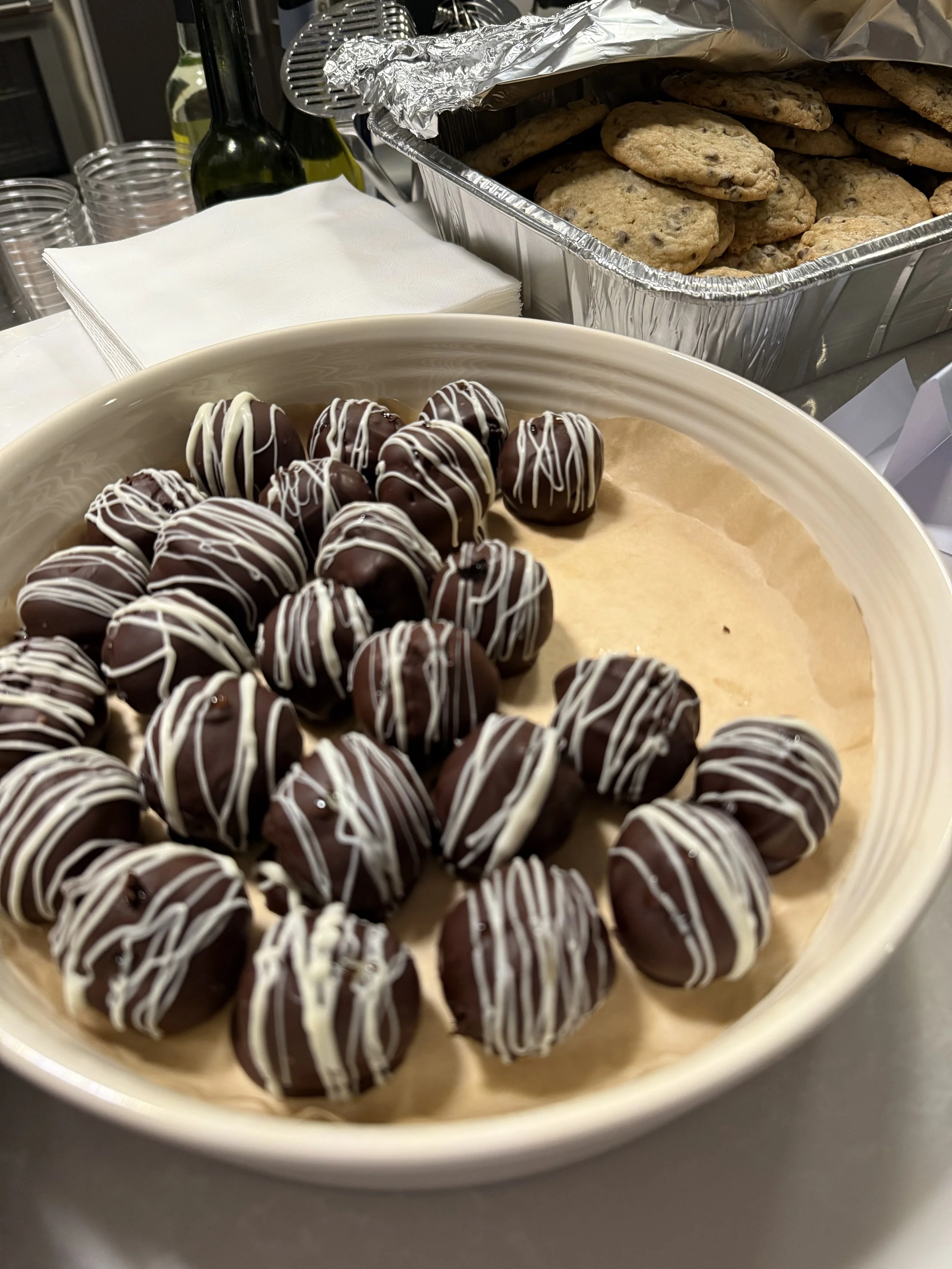 Our homemade Democratic bakers delivered some show-stoppers. Lisa’s chocolate chip cookies struck that elusive balance of chewy and crisp perfection; Kerry’s chocolate crème brûlée was restaurant-quality (and we mean the kind of restaurant that gives you linen napkins); and Amy—yes, the Cicchiello prodigal daughter—brought a platter of homemade truffles that could make Ghirardelli weep.